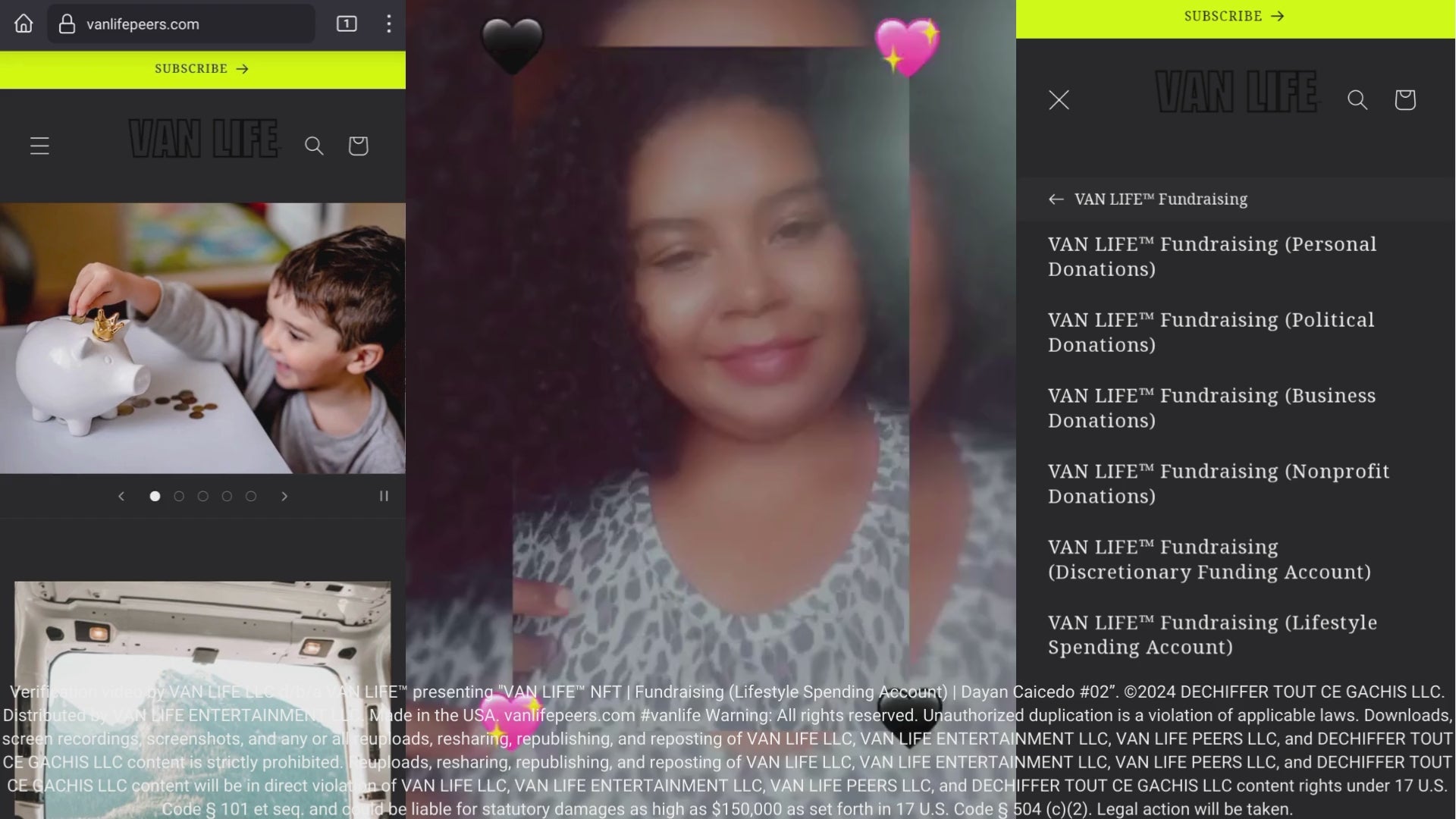 Video de verificación de VAN LIFE LLC d/b/a VAN LIFE™ que presenta "VAN LIFE™ NFT | Recaudación de fondos (Cuenta de gastos de estilo de vida) | Dayan Caicedo #02”. ©2024 DECHIFFER TOUT CE GACHIS LLC. Distribuido por VAN LIFE ENTERTAINMENT LLC. Realizado en los EE. UU. vanlifepeers.com #vanlife Advertencia: Todos los derechos reservados la duplicación no autorizada es una violación de las leyes aplicables. Descargas, grabaciones de pantalla, capturas de pantalla y todas las recargas, compartir, republicar y volver a publicar de VAN LIFE LLC, VAN LIFE. El contenido de ENTERTAINMENT LLC, VAN LIFE PEERS LLC y DECHIFFER TOUT CE GACHIS LLC está estrictamente prohibido. Volver a cargar, compartir, republicar y volver a publicar contenido de VAN LIFE LLC, VAN LIFE ENTERTAINMENT LLC, VAN LIFE PEERS LLC y DECHIFFER TOUT CE GACHIS LLC. estaría en violación directa de los derechos de contenido de VAN LIFE LLC, VAN LIFE ENTERTAINMENT LLC, VAN LIFE PEERS LLC y DECHIFFER TOUT CE GACHIS LLC según 17 Código de EE. UU. § 101 et seq y podría ser responsable de daños legales de hasta $150,000 como se establece. en 17 Código de EE. UU. § 504 (c)(2). Se tomarán acciones legales. Este VAN LIFE™ NFT es un token coleccionable que se puede verificar como una tarjeta de membresía, admisión y/o pase digital. Todos los compradores y titulares de un NFT de VAN LIFE™ están sujetos a los términos, acuerdos, políticas y avisos de la plataforma VAN LIFE™ Peers (https://vanlifepeers.com).
